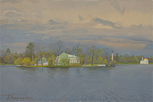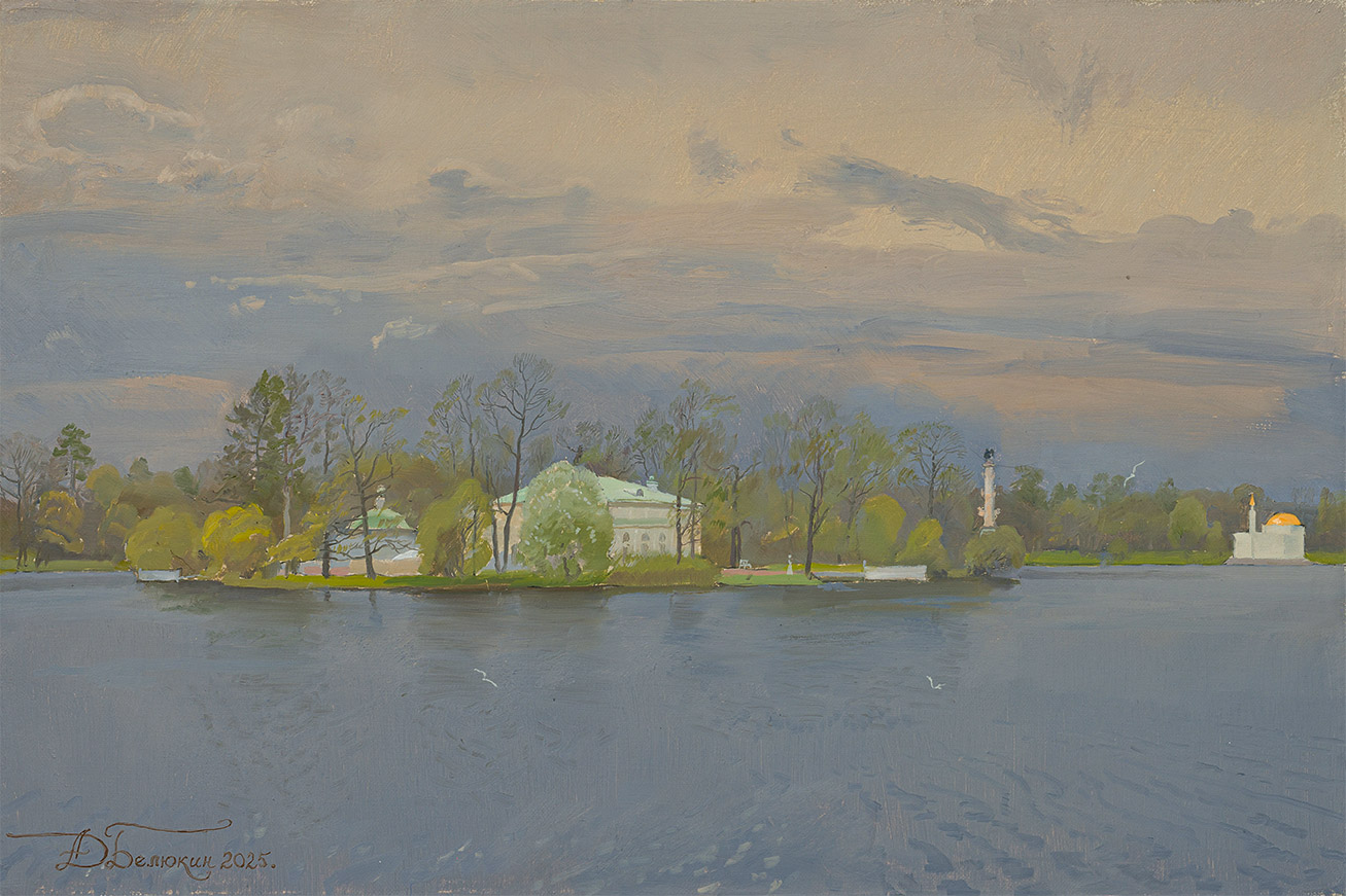 Большой пруд, остров с люстгаузом и Чесменская колонна в Царском селе